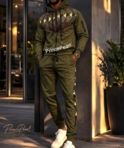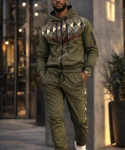 Mens 2 Piece Olive Green Ankara Sweat Track Sport Jogger Suit