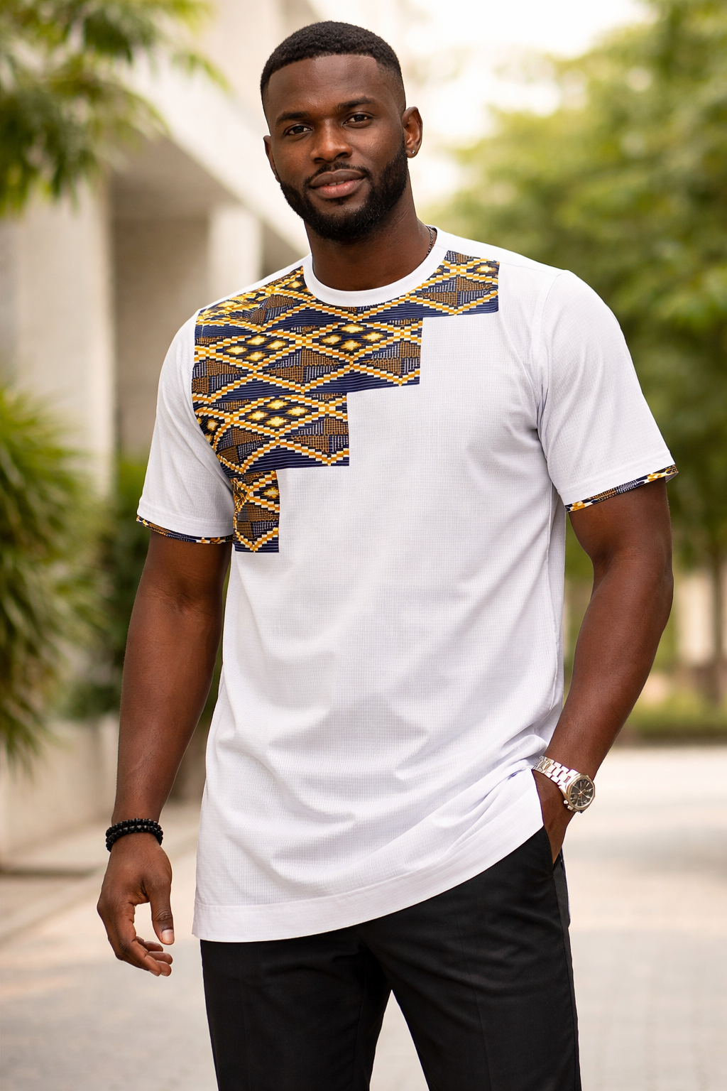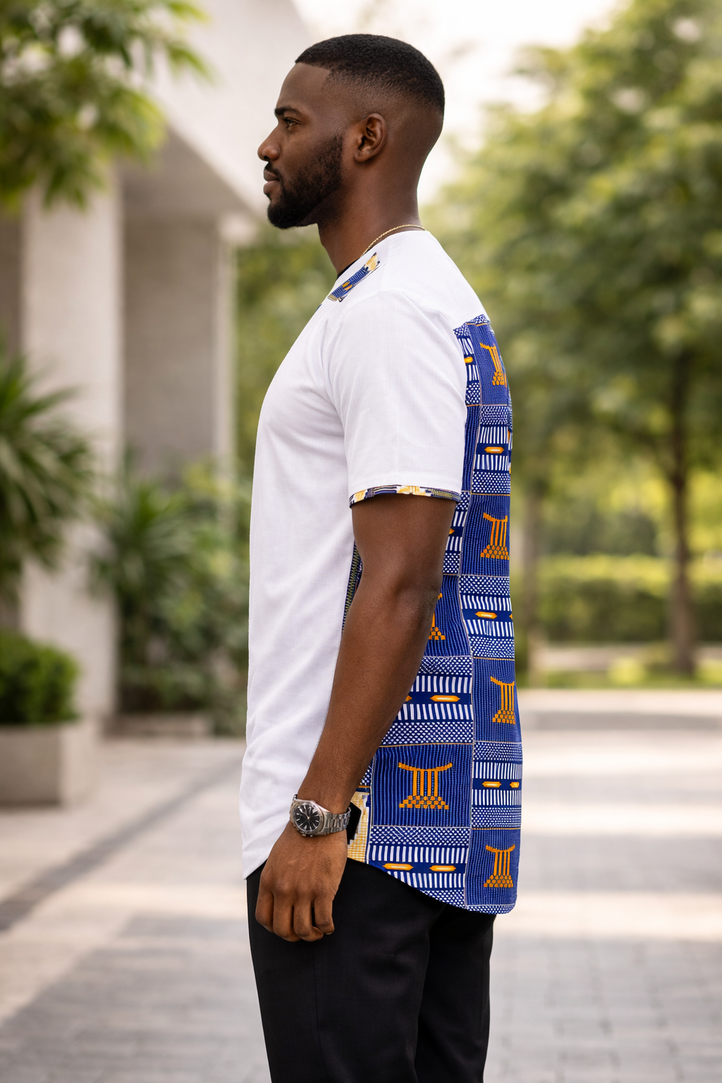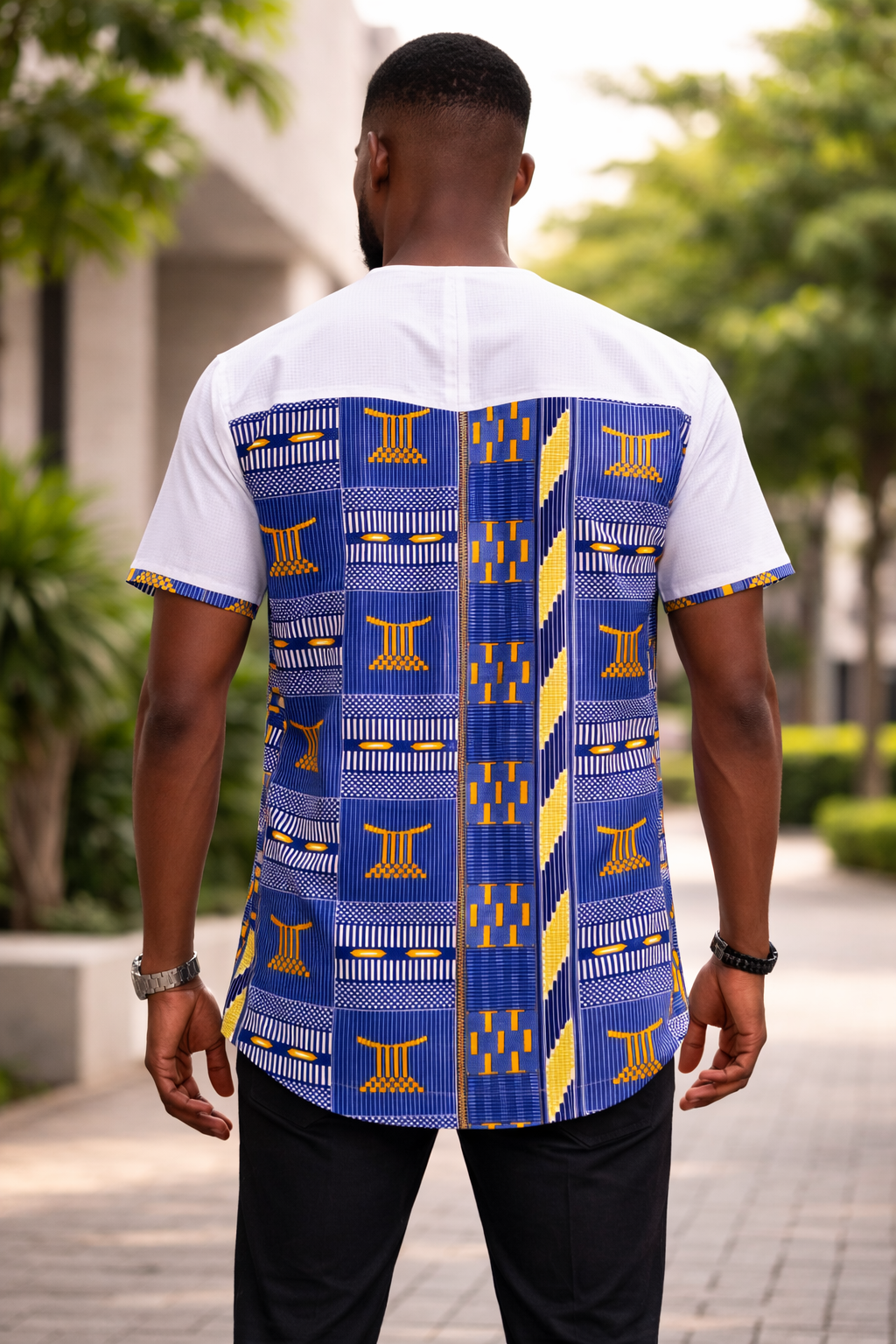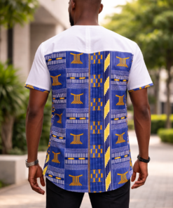 White Polished Cotton Jersey Style Shirt With Blue Kente